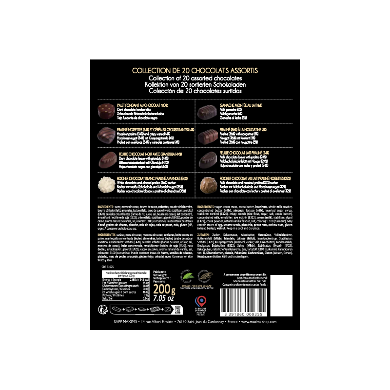 In a “Christmas” decorated box of 20 pure cocoa butter chocolates: