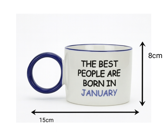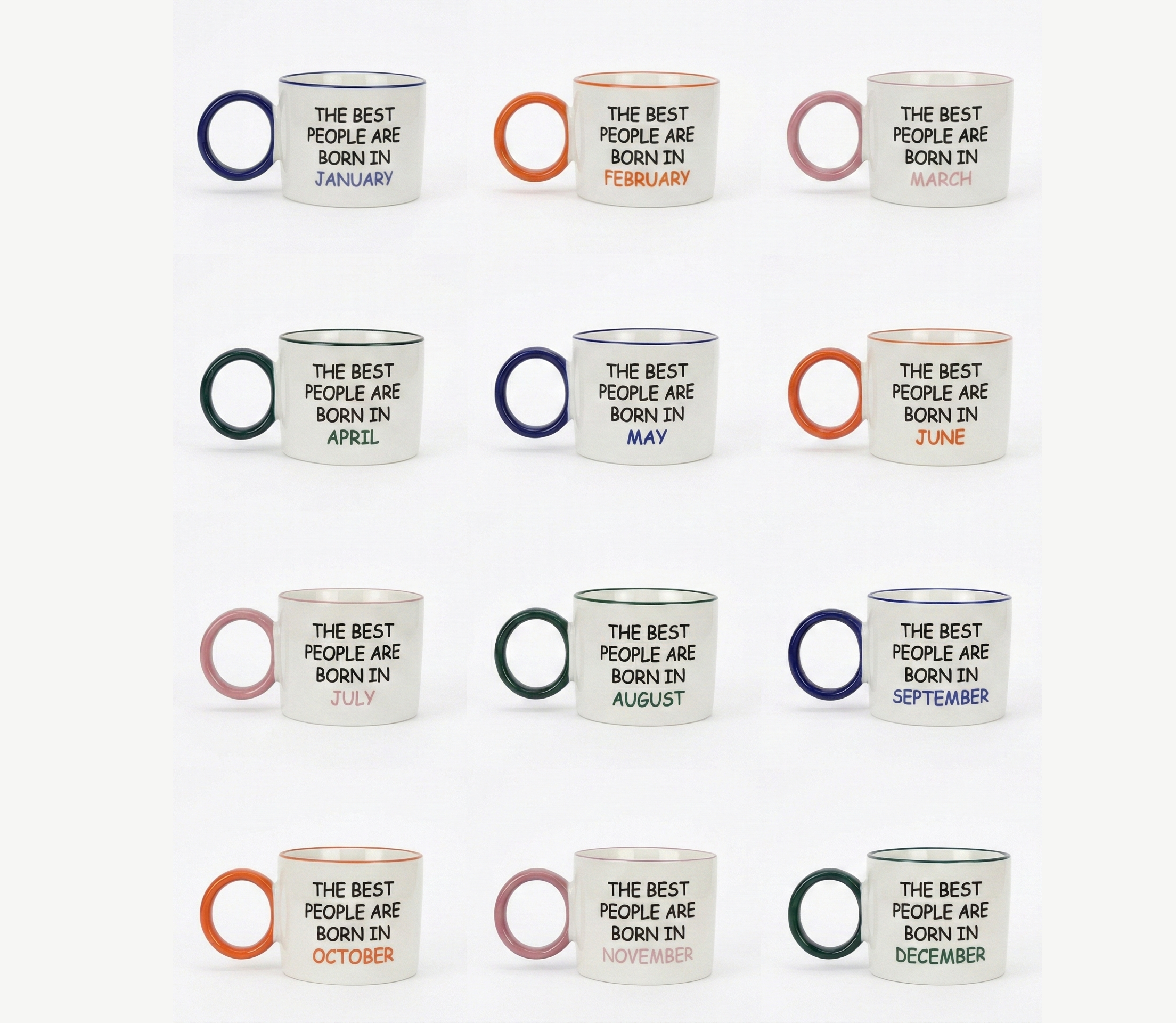 Add a pop of color to your morning routine with these trend-setting birthday mugs. Featuring the popular “donut” style ring handle and matching rim, each mug celebrates a specific birth month with the cheeky affirmation: “The Best People Are Born In…” Perfect for that friend who loves a statement piece, or as a treat for yourself to celebrate your special month in style.