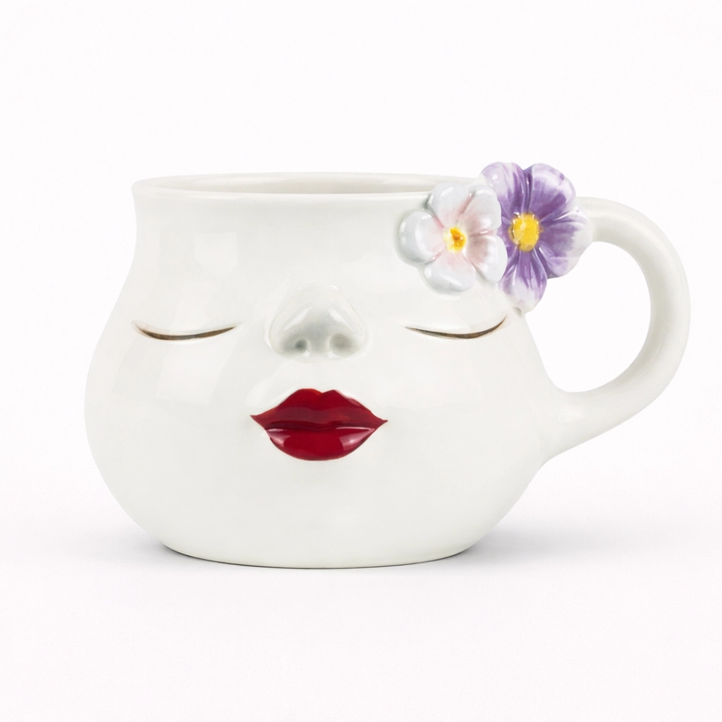 Add a touch of serenity and artistic flair to your morning routine with our Porcelain Floral Face Mug. A highlight of our First Collection, this unique vessel is beautifully sculpted in the shape of a peaceful face, featuring a smooth white finish, a dainty 3D nose, and gently closed eyes with delicate lash details.
