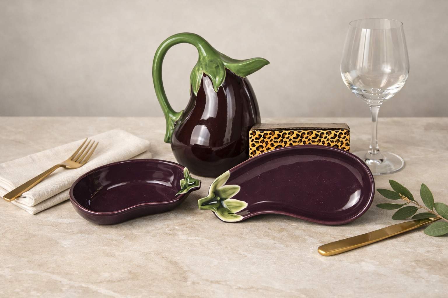 The ultimate trio for vegetable lovers. This set includes the large Pitcher, the serving Plate, and the mini Dipping Bowl. Each piece features the signature high-gloss purple glaze and sculpted green stem, giving you the complete look for your table.